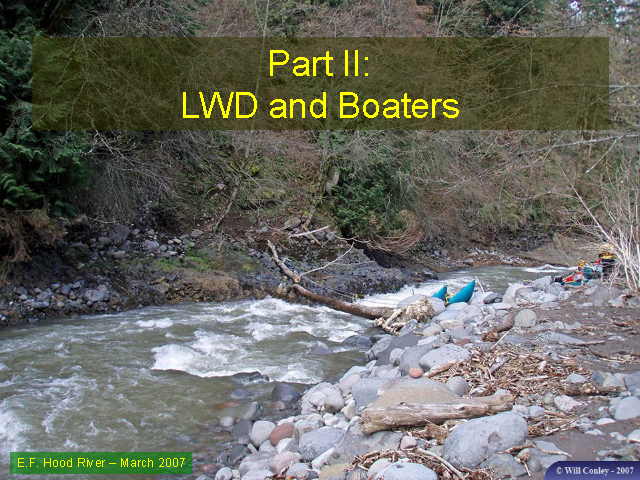 Photo is of a channel-spanning log on the EF Hood River. This type of position increases risk to boaters.