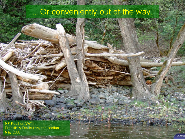 In this case, LWD has been strained-out by riparian trees at the downstream end of a bar and high-flow channel