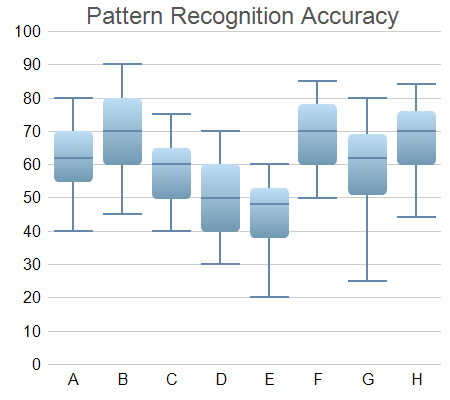This example extends the Box-Whisker Chart (1) example to demonstrates various methods to control the chart appearance, including using different colors and font size, and using gradient shading and rounded corners for the boxes.