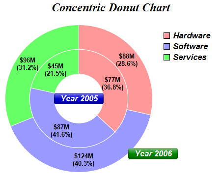 This example demonstrates creating concentric donut chart by merging two donuts of different radii.