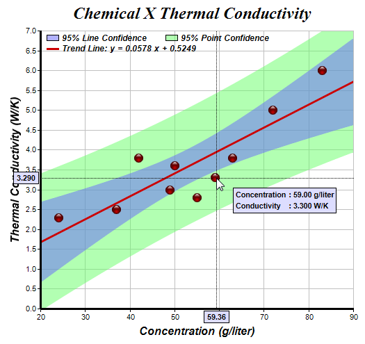 This sample program demonstrates a track cursor programmed as a crosshair cursor with axis labels. In additional, it demonstrates using hot spot events to pop up a box when the mouse is over a data point or the trend line, showing information about these objects with HTML formatting.