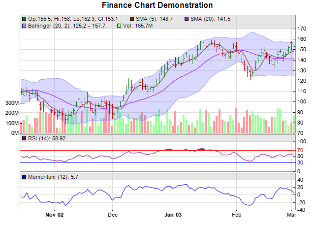 This example demonstrate creating a full-featured finance chart, with HLOC, moving averages, Bollinger band, volume bars, RSI and Momentum indicators.