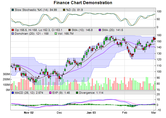 This example demonstrate creating a full-featured finance chart, with candlesticks, moving averages, Donchian channel, volume bars, MACD and Stochastic indicators.