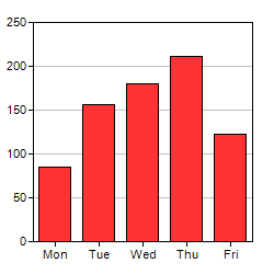 For this simple bar chart, we will use the majority of the chart area to draw the bar chart. We will leave some margin to allow for the text labels on the axis. In the above code, the top-left corner is set to (30, 30), and both the width and height is set to 200 pixels. Since the entire chart is 250 x 250 in size, there will be 20 to 30 pixels margin for the text labels.