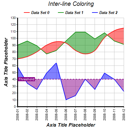 In this example, an InterLineLayer is used to fill the region between a normal line and a spline curve. Another InterLineLayer is used to fill the region between a normal line and a mark line. The fill color differs depending on which line is on top.