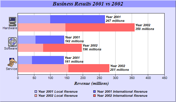 This example demonstrates combining multi-bar style with stacked bar style. It also demonstrates drawing horizontal bar charts, using icons in axis labels with