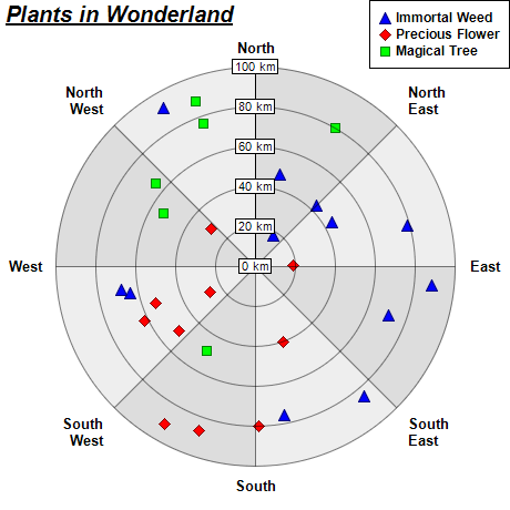 This example demonstrates how to create polar scatter charts. It also demonstrates using alternating background colors along the angular direction.
