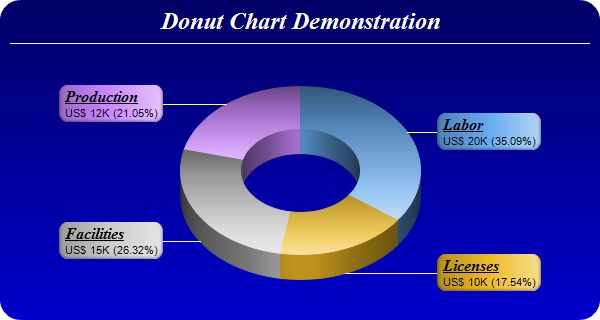 This example demonstrates a 3D donut chart with sector gradient shading. It also demonstrates gradient color background, rounded frame, custom sector colors, and using
