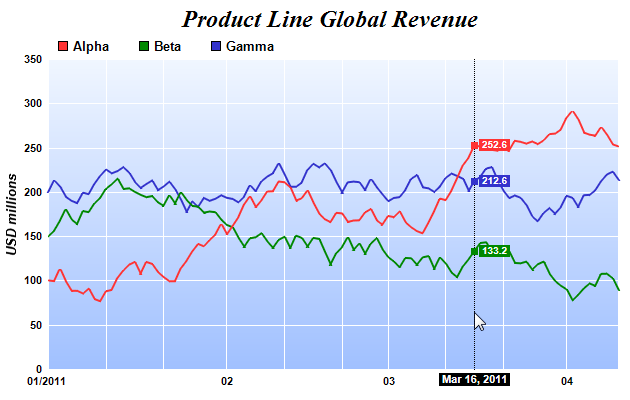 - A vertical line that follows the mouse cursor on the plot area and snaps to the nearest x data value, with a label on the x-axis displaying that value.